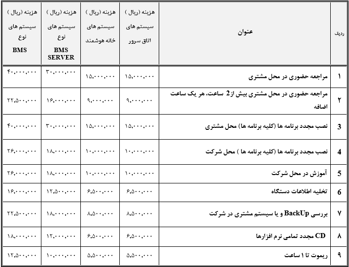 تعرفه خدمات اشتراک بخش پشتیبانی سال 1404 سیستم های BMS